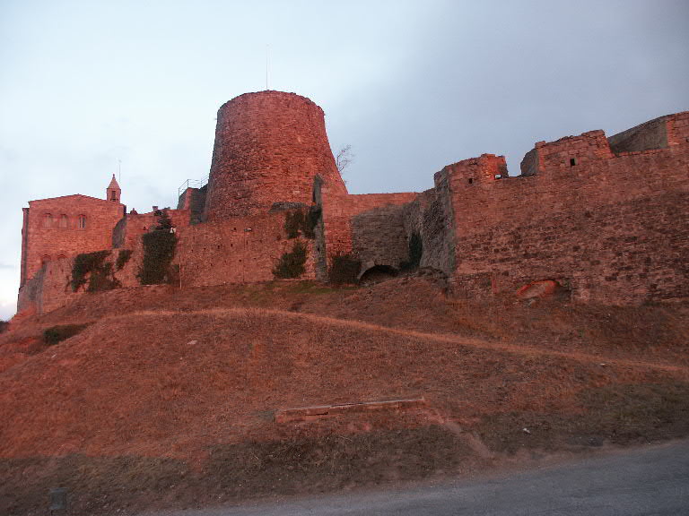 De ondergaande zon kleurt het kasteel.